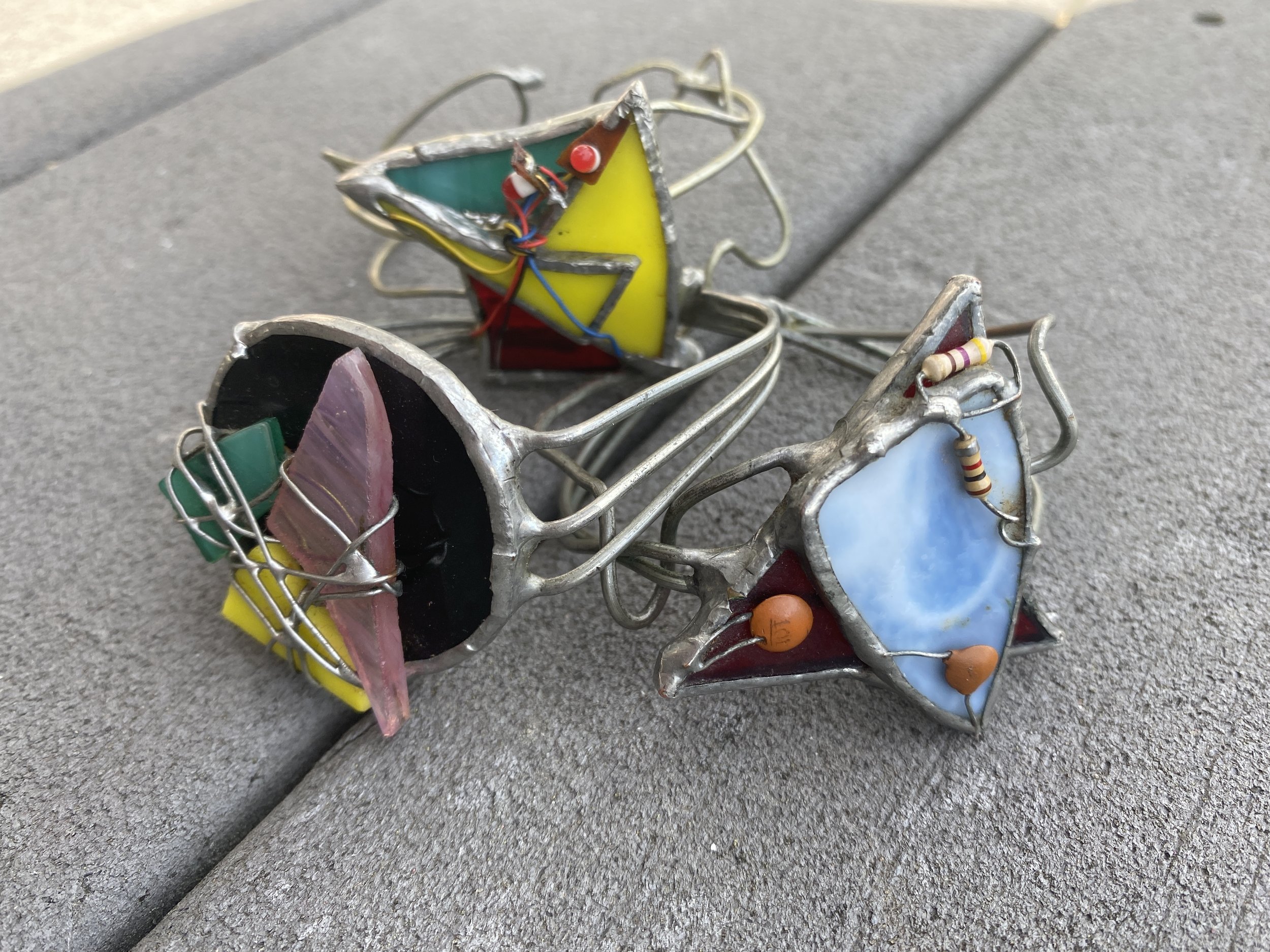 It all began with a piece of iridescent stained glass and a little skill and imagination. Bracelets - stained glass and transistors 1987.