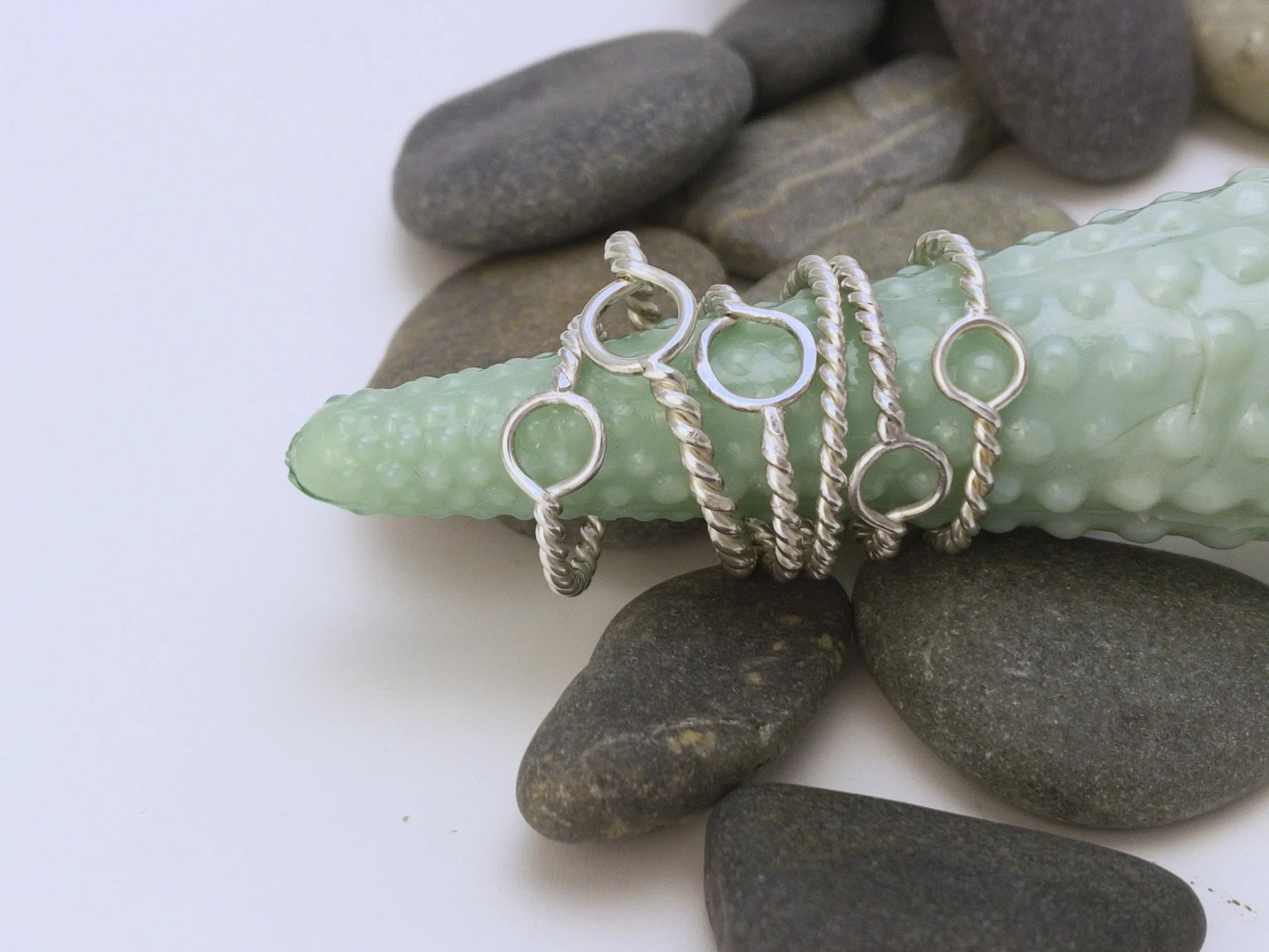A twisted band, and a twisted setting in sterling silver show off a humble CZ. the 5mm stone is nestled in a twisted embrace on a 3mm band. This ring makes a good stacker or can be worn alone.